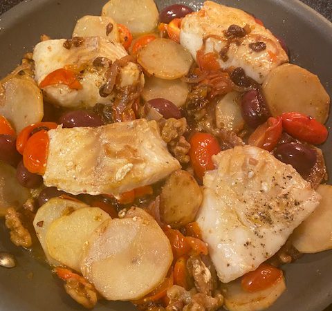 Cod fish prepared in Portuguese style. Olive oil is the secret of this recipe as it is a traditional Portuguese accompaniment for cod fish. Assuming you have fresh or frozen codfish (unsalted). The tradition is to use salted codfish, which would require scalding and is not being considered here.