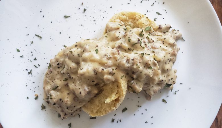 A hearty breakfast can be like that toasty warm blanket to help wake you up on the coming chilly days. Biscuits smothered in a sausage gravy are just such a meal. This recipe has the added crunch of onions and a surprising element of sweetness from a drizzle of honey. Round out the breakfast plate with a fried egg and crispy bacon.