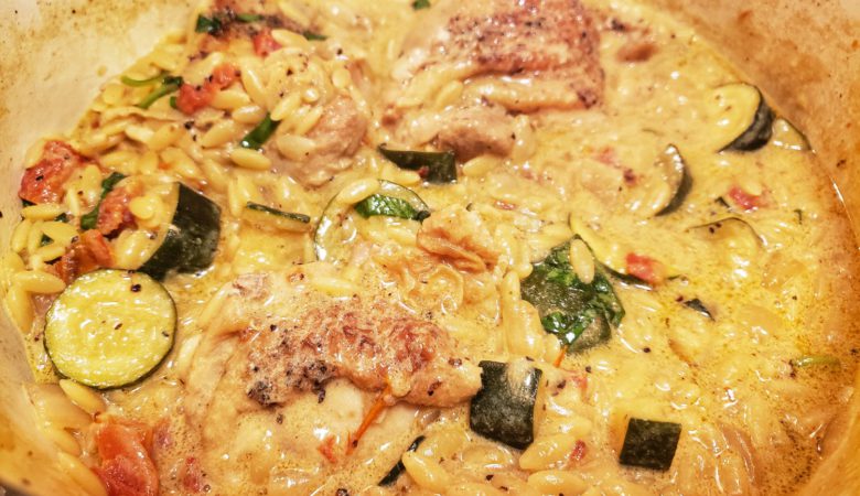 A great one-pot dinner idea! Small orzo pasta nestled in a creamy sauce with zucchini and chicken thighs. Green beans or spinach can be substituted for the zucchini.