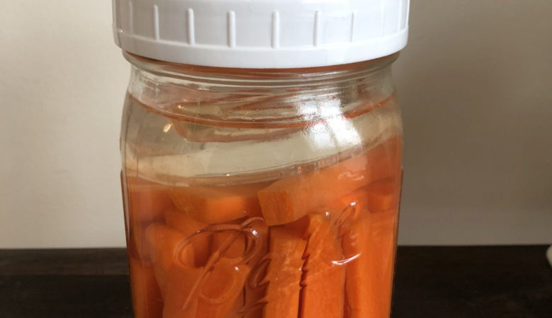These naturally lacto-fermented carrots are crunchy and tangy. Perfect with a tasty dip like hummus!