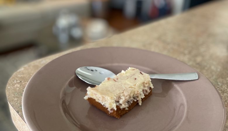 It can be served warm or cool, with powdered sugar or maple syrup.