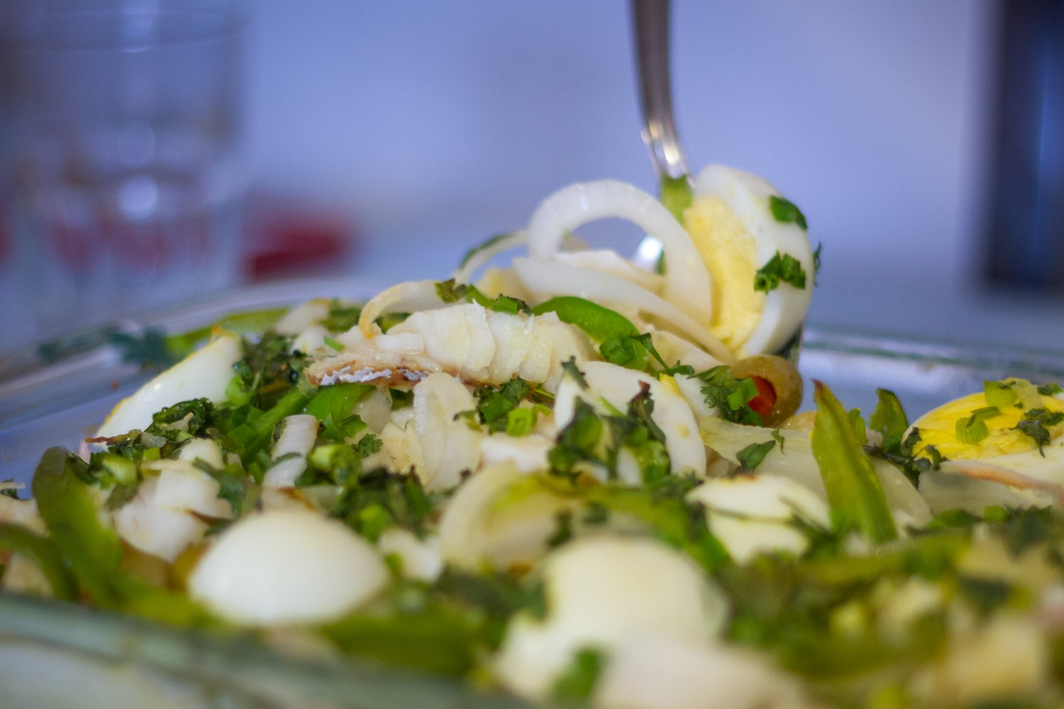 3Mix the boiled potatoes, the codfish, sliced onion, and green pepper on a platter. Slice the boiled eggs and lay on top. Scatter the scallion, onions, cilantro, and olives on top. Pour 2 tbsp of vinegar and then the olive oil across the dish, distributing it homogeneously (olive oil may accumulate on the bottom of the platter).