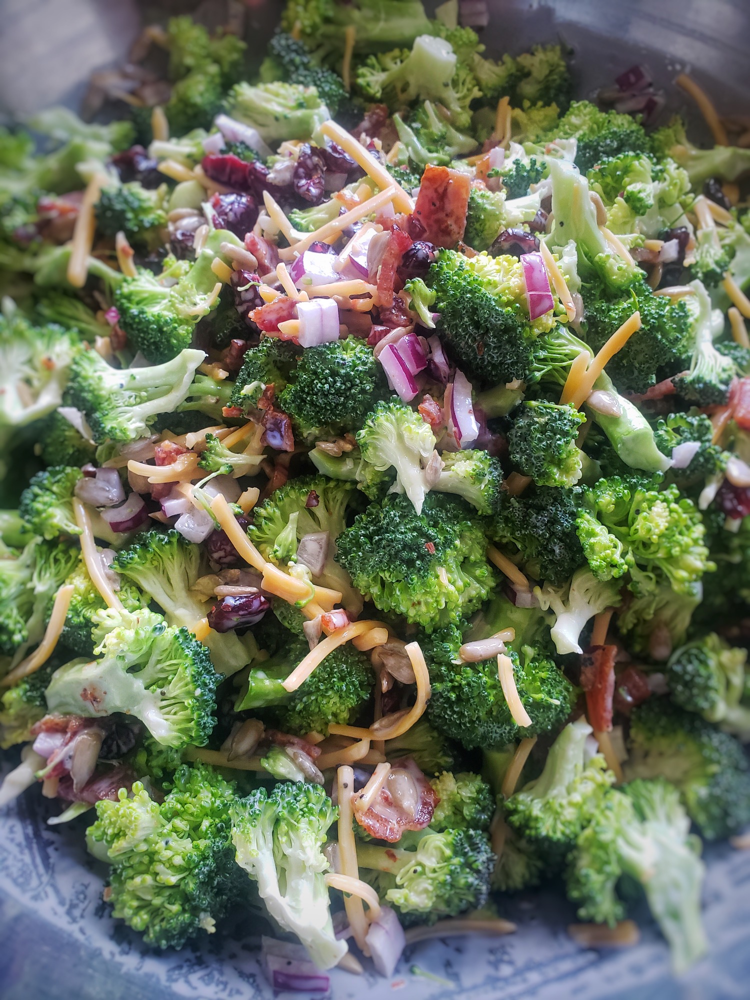 Small crunchy broccoli florets, salty bacon, spicy onion and sweet cranberries make up this perfect-picnic-salad. Mix everything together at least 30 minutes before, or for best results about 4 hours or more.