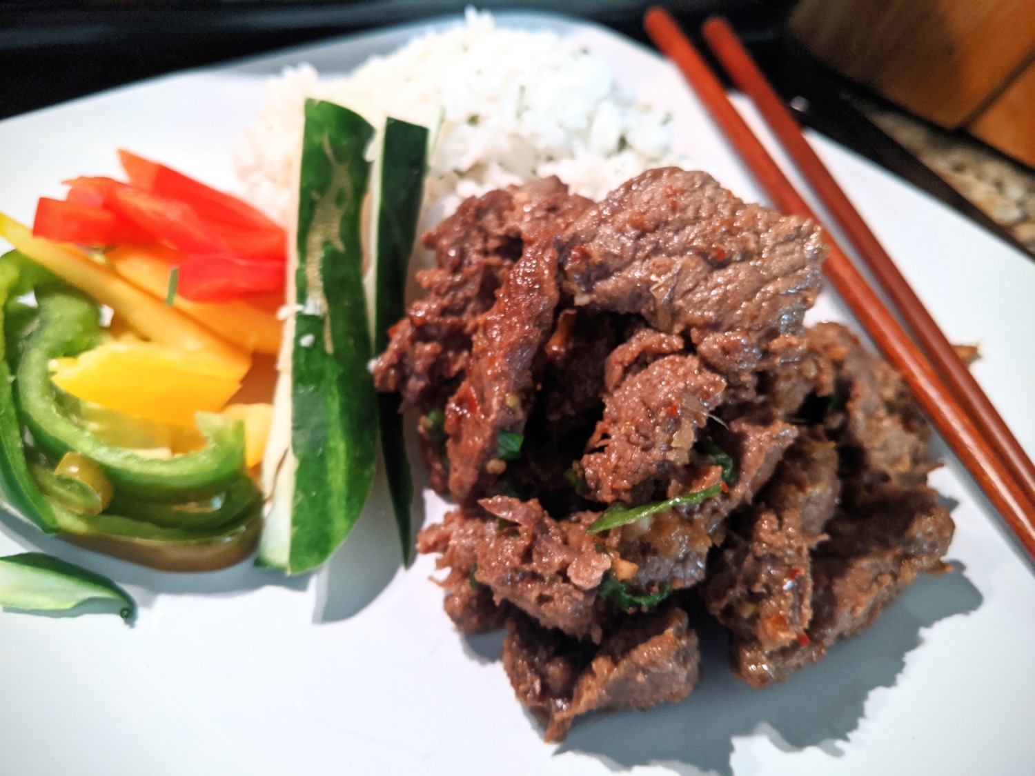 2Heat 1 Tbsp. vegetable oil in a large skillet over medium-high until oil is shimmering. Remove half of meat from marinade, letting excess drip back into bag; season lightly with salt and cook in a single layer without moving until lightly browned, about 1 minute. Toss meat and continue to cook, tossing occasionally, until cooked through and crisp at edges, about 3 minutes. Transfer to a plate. Repeat with remaining 1 Tbsp. vegetable oil, remaining meat, and more salt.