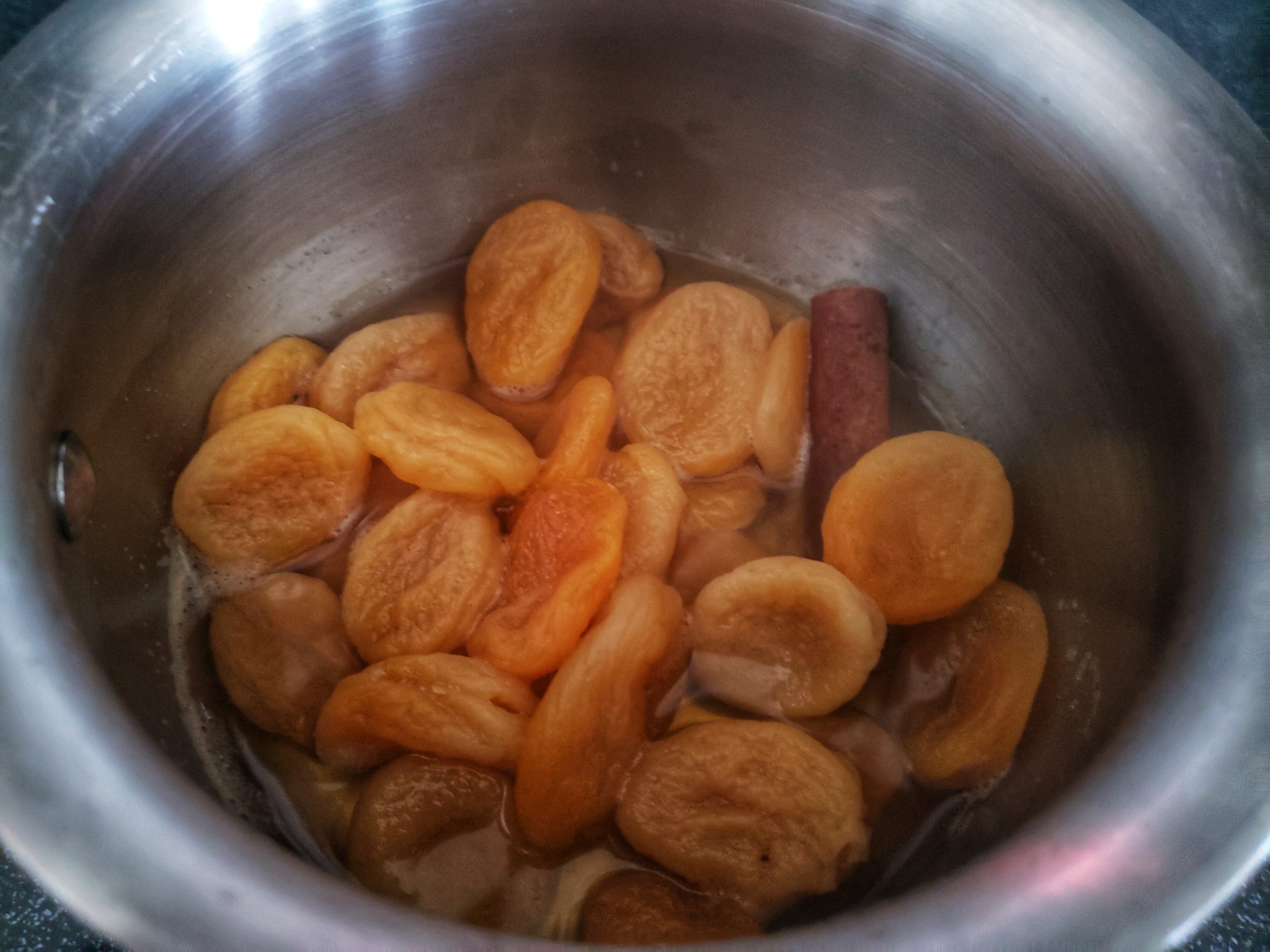 5In a small saucepan heat apricots, cinnamon stick, water and honey to a simmer. Allow liquid to simmer down to about 2 tbsp of liquid. About 10-12 minutes. Remove cinnamon stick and let cool.