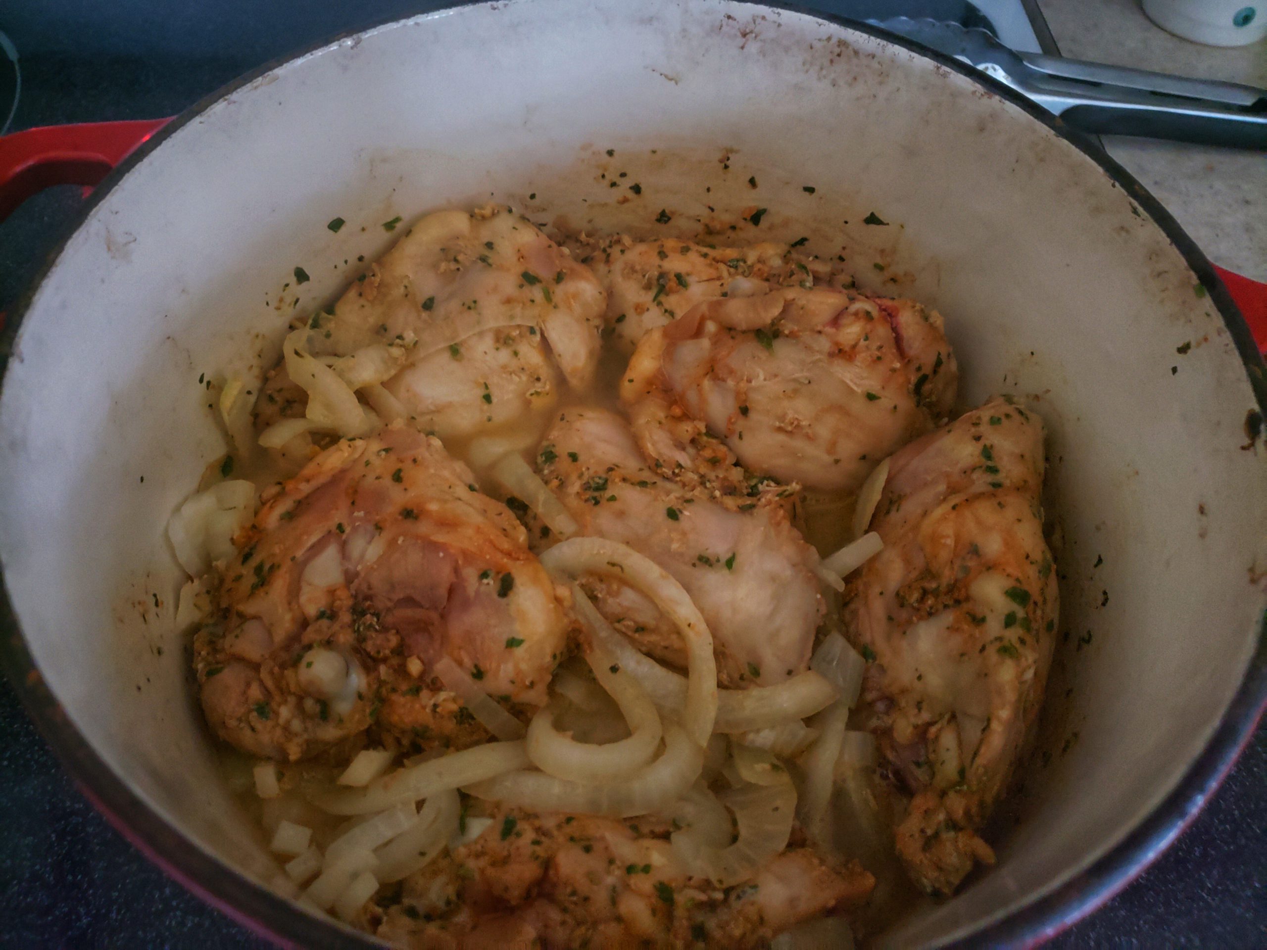 Add to it the onions and butter. Scatter chicken thighs and any excess marinade over onions. As the onions cook down, flip chicken, until onions become translucent.