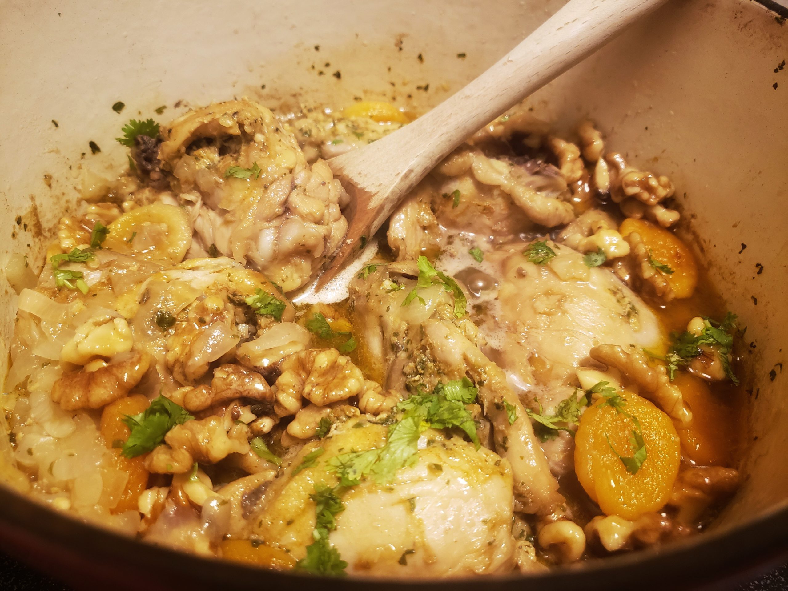 7When chicken is done cooking, add apricot syrup and apricots to pot. Let it cook together for about 10 minutes. Taste broth and season with salt if need be.