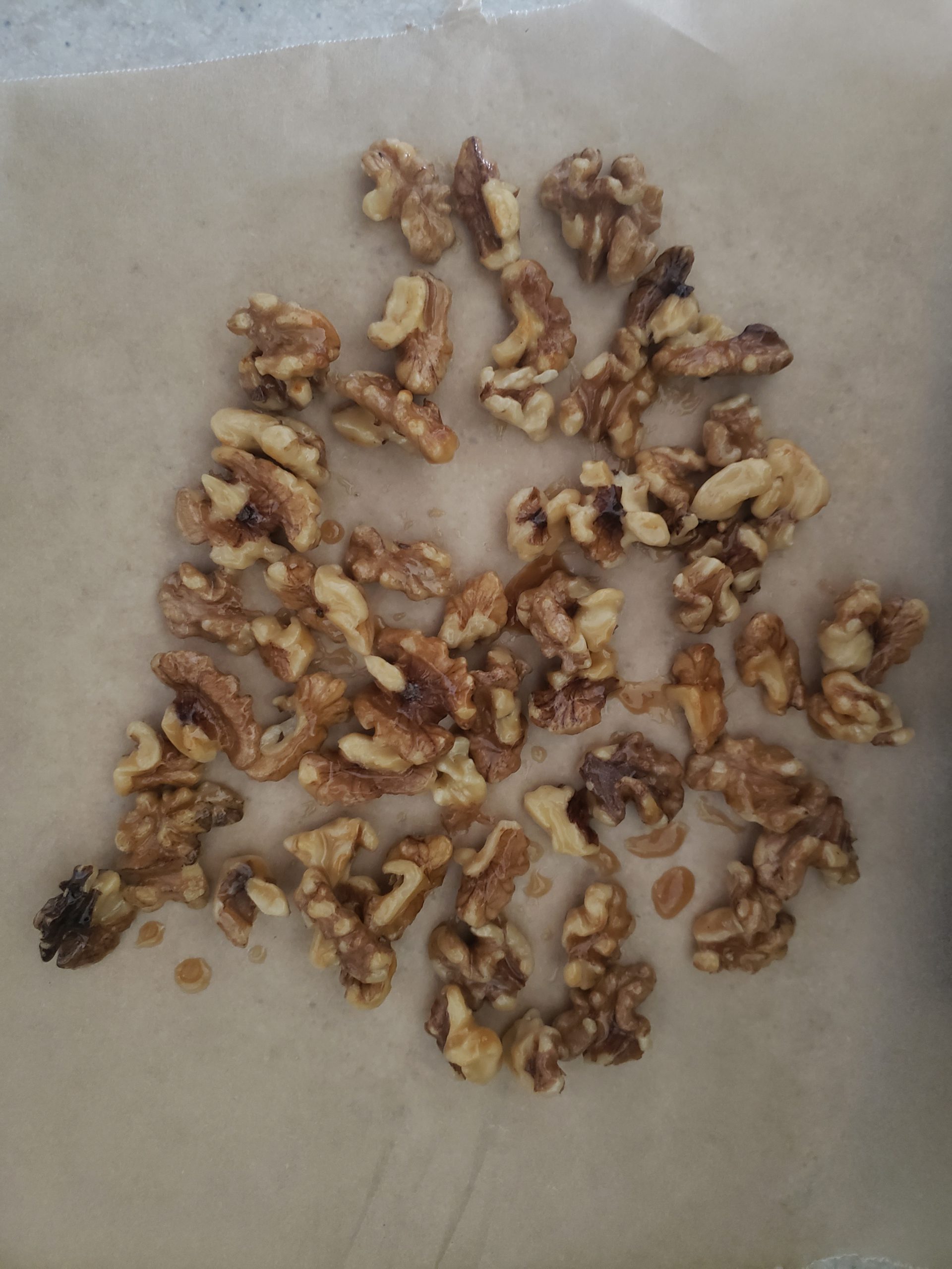 6For walnuts; In a non stick skillet, heat butter, walnuts and honey. Stir and cook until walnuts are toasted and coated. Remove from heat and place in a single layer on parchment paper to cool.