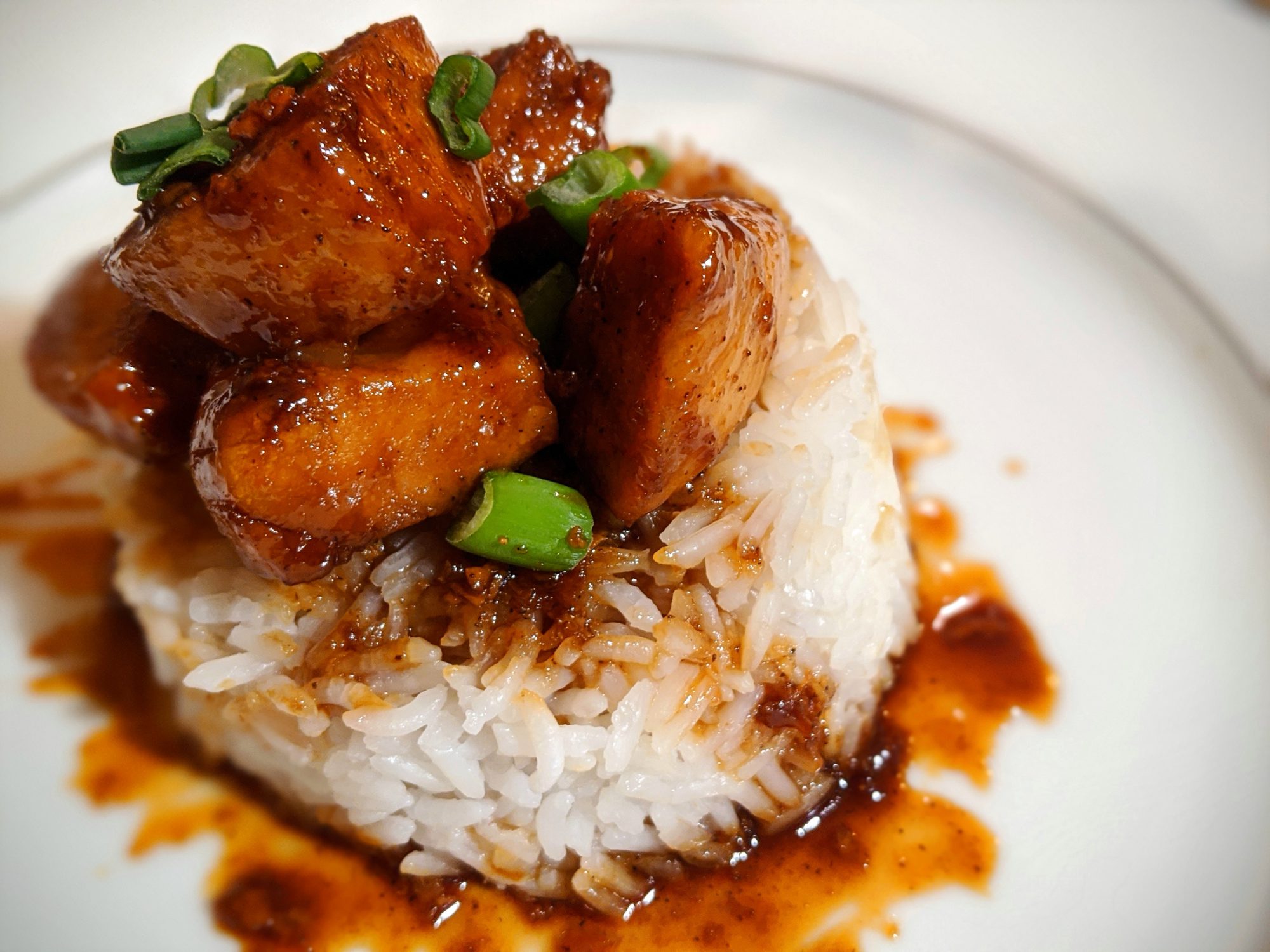 7Remove from heat, and serve immediately with cooked white rice and steamed broccoli, garnished with thinly-sliced green onions if desired.