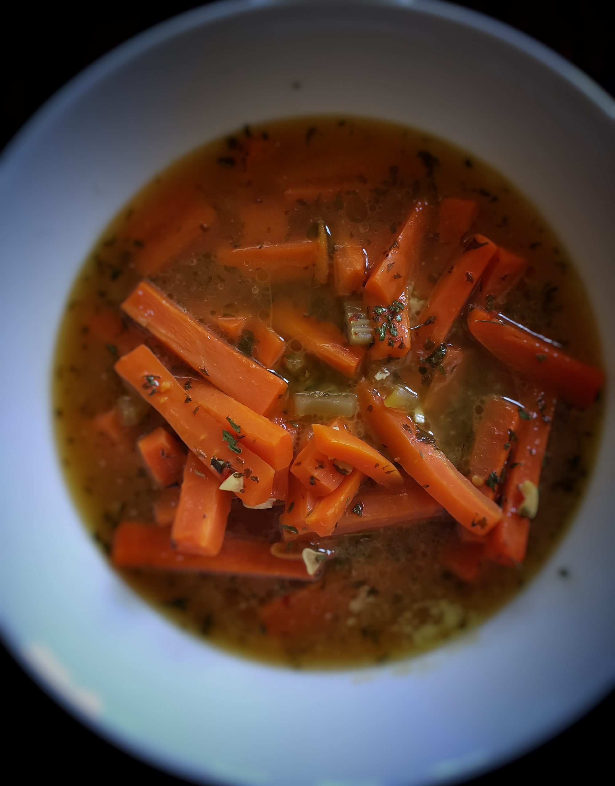 In a medium saucepan, over med-high heat, simmer carrots, celery, chicken broth and garlic, until carrots are barely tender, about 10-15 minutes.