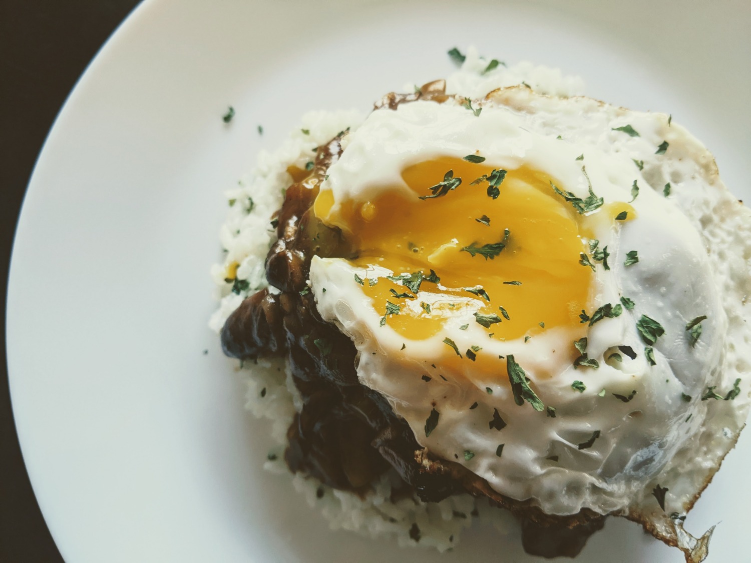 4Use the rice as the base. Place the patty on top. Add the gravy. Top it all off with the egg. Wear a hula shirt. Eat. Then, play the ukulele.