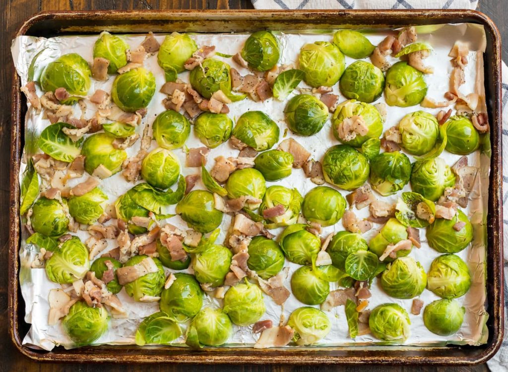 2Cut the bacon into ¼-inch pieces. Place them on top of the Brussels sprouts.