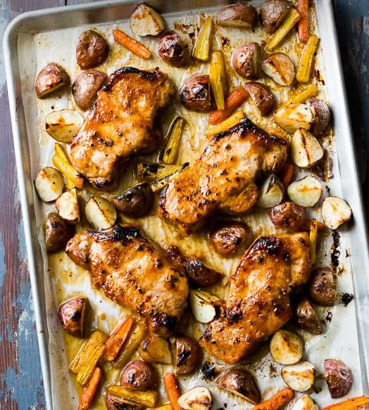 Brush leftover marinade over the potatoes, carrots, and the pork chops.
