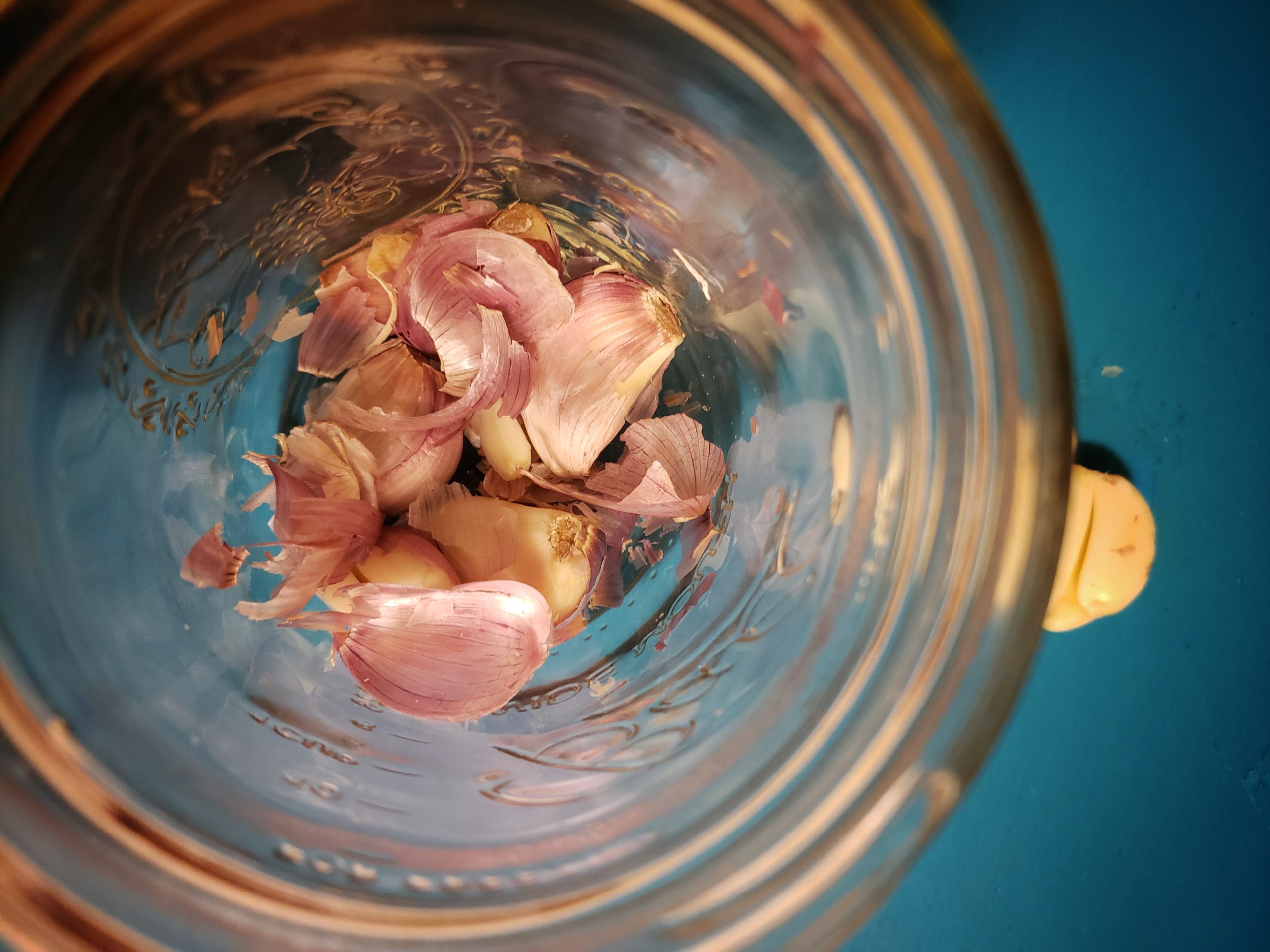 Place 1/2 garlic cloves, unpeeled in jar with lid.