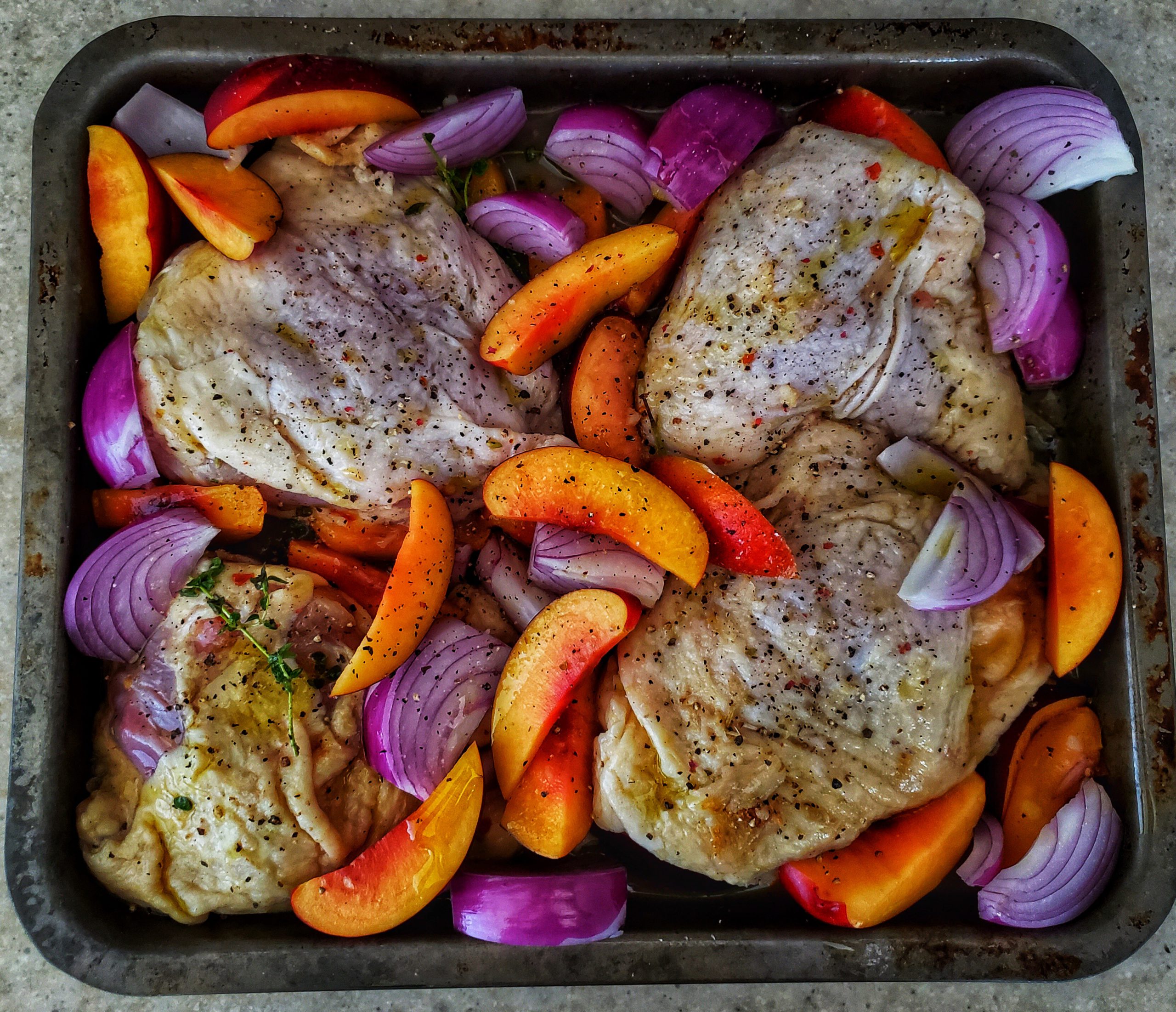 2Preheat oven to 400 degree. Using a large sheet pan, spread out chicken (skin side up), fruit and marinade. Add onion wedges. Sprinkle salt and pepper over the pan along with a drizzle of olive oil.