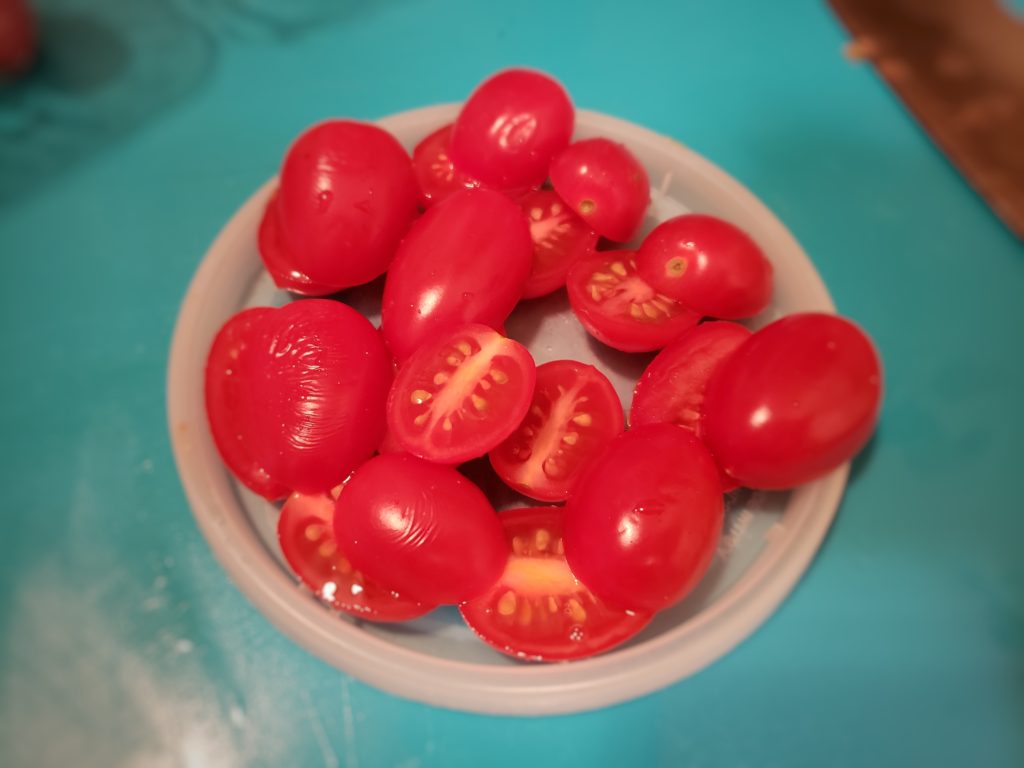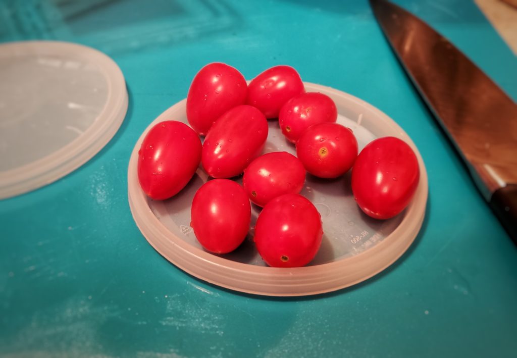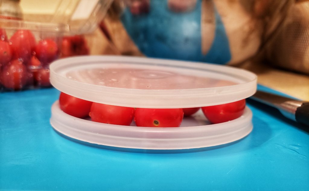 Using one of the lids, place it with the ridges up, and lay 10-12, rinsed, cherry tomatoes on it.