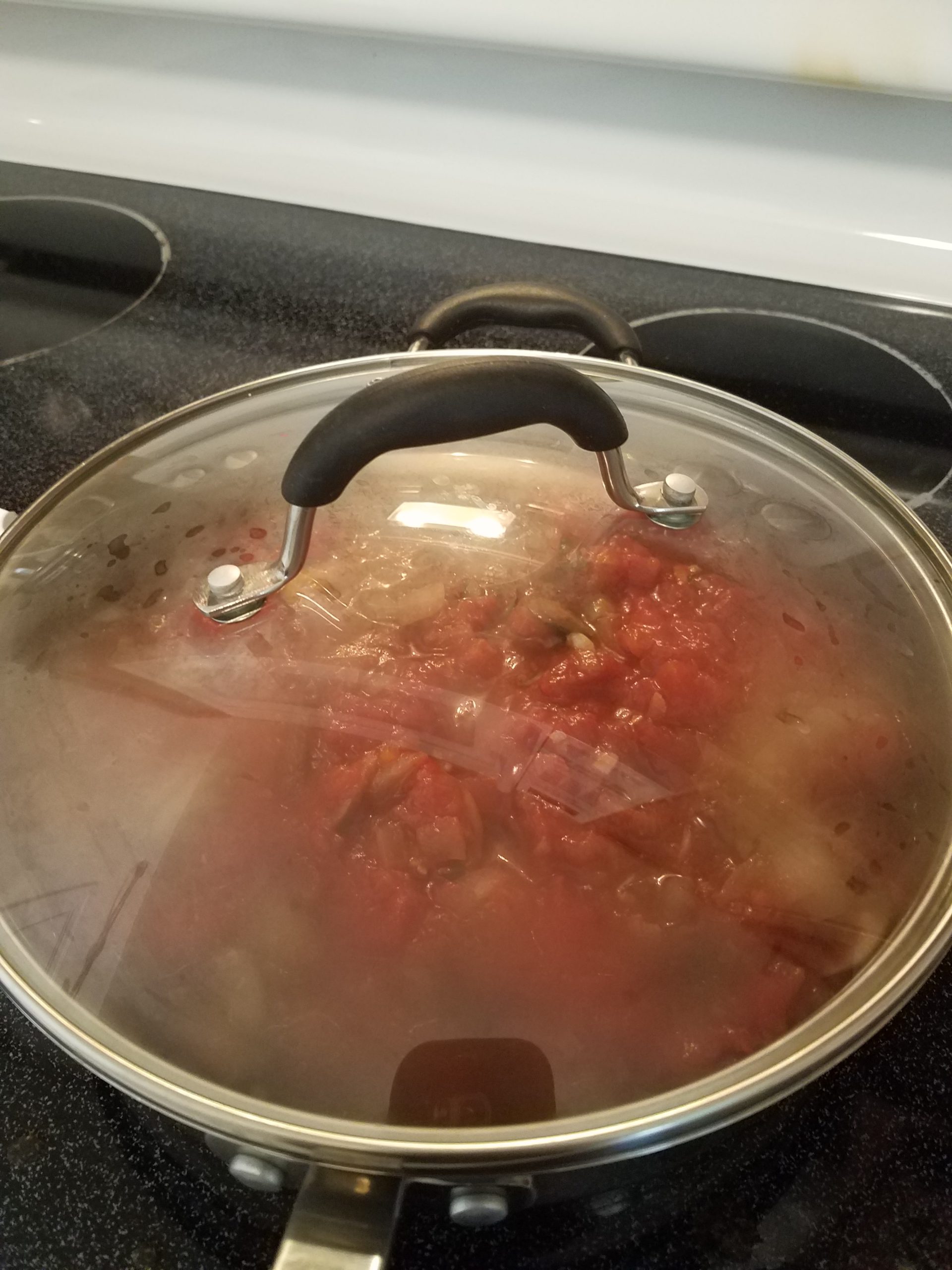5Stir in the whole can of diced tomatoes into the pan, along with the 2 bay leaves. Place a lid on the pan and let it simmer for 5 minutes.