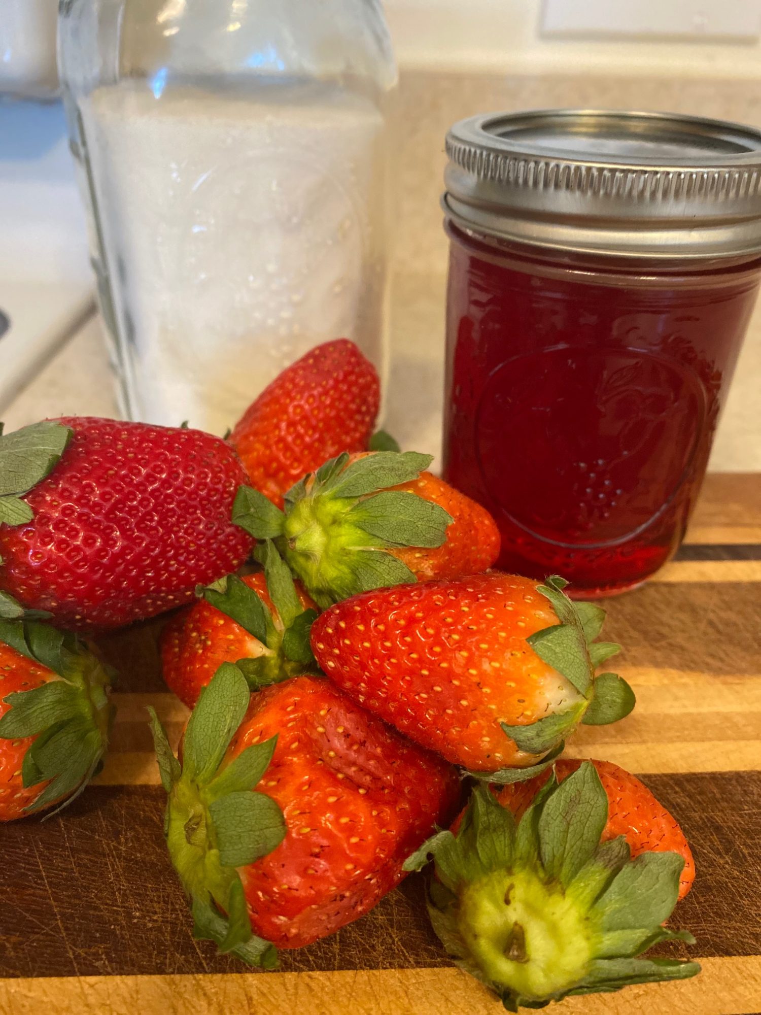 A sip of Summer! This is a fruit-infused simple syrup that can be used for pancakes, added to Seltzer water for a refreshing drink.