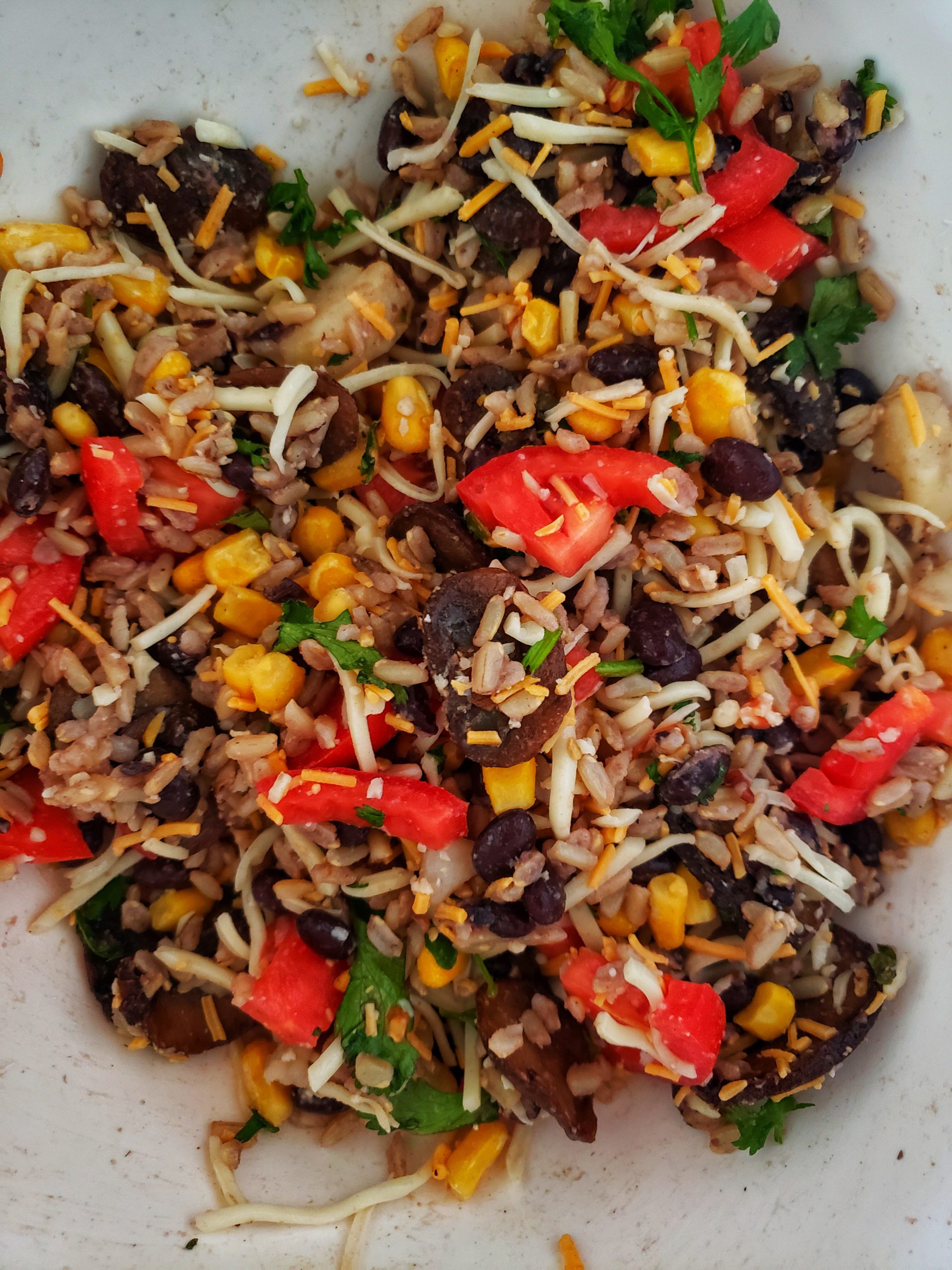 Example shown; cooked rice and beans, sautéed mushrooms, corn, chopped tomatoes, mozzarella and cheddar cheese.