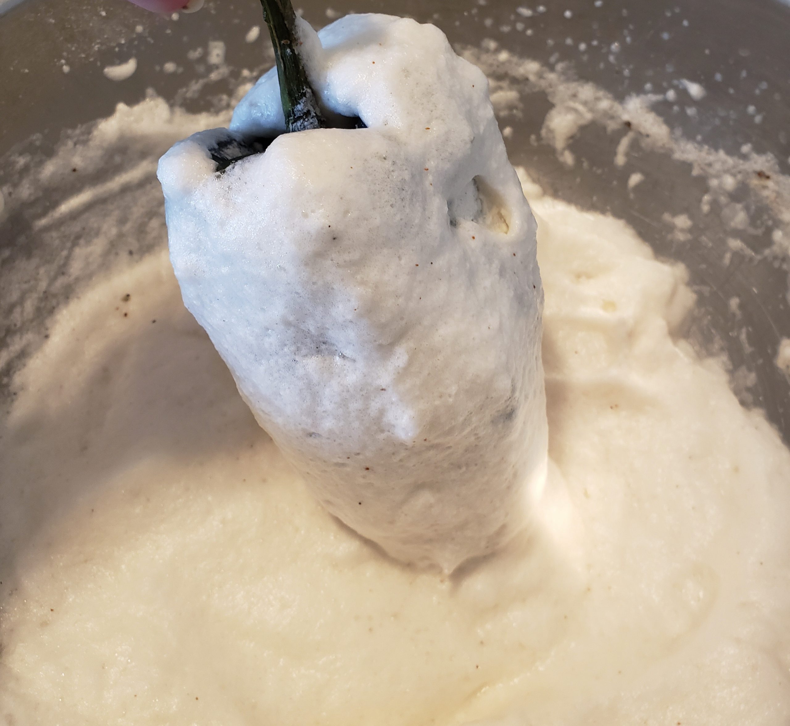 6Using the stem of the pepper, dredge into egg white batter, completely covering pepper.