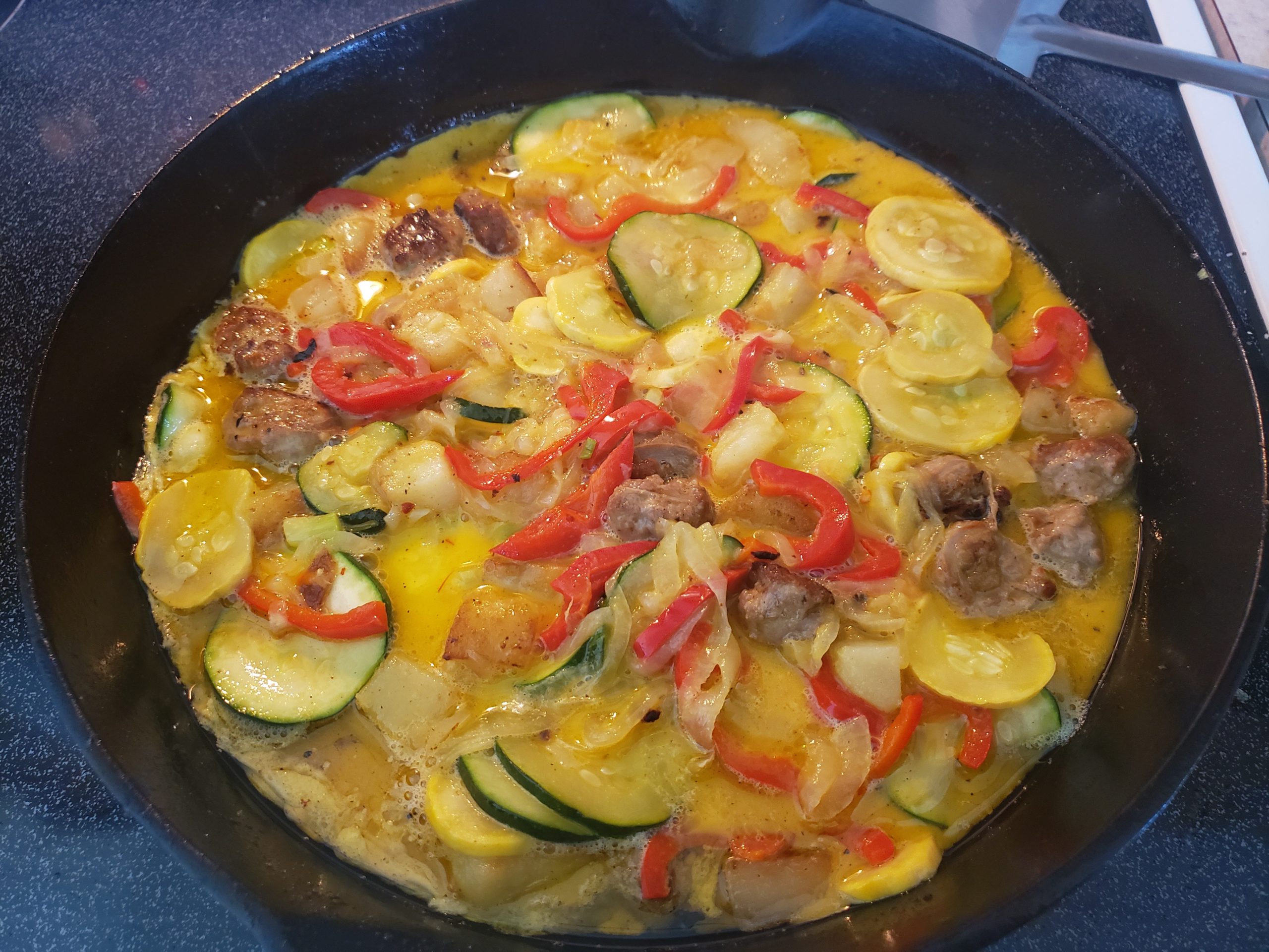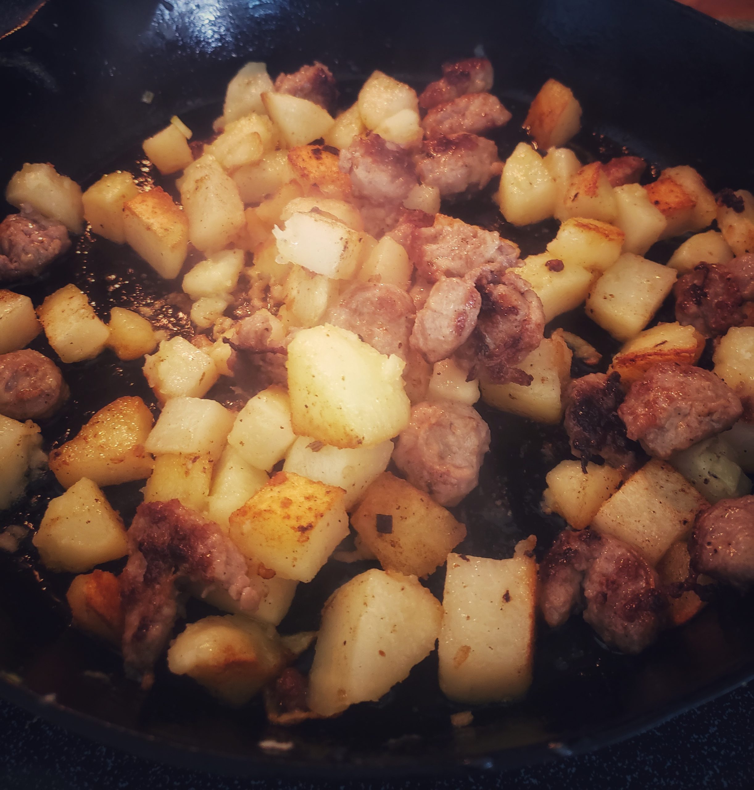 3In the same skillet fry sausage and potatoes. Allow to cool and mix with veggies.