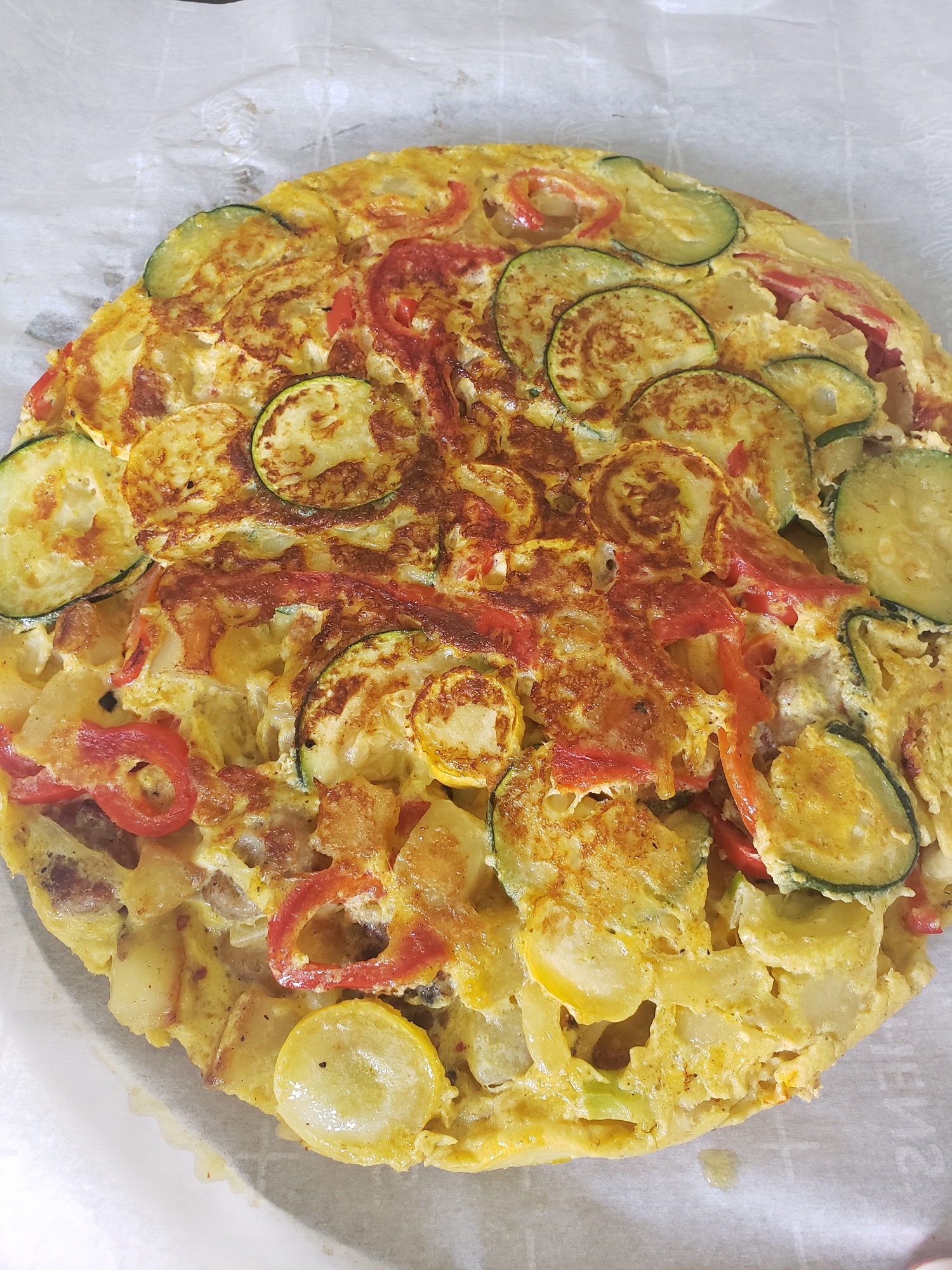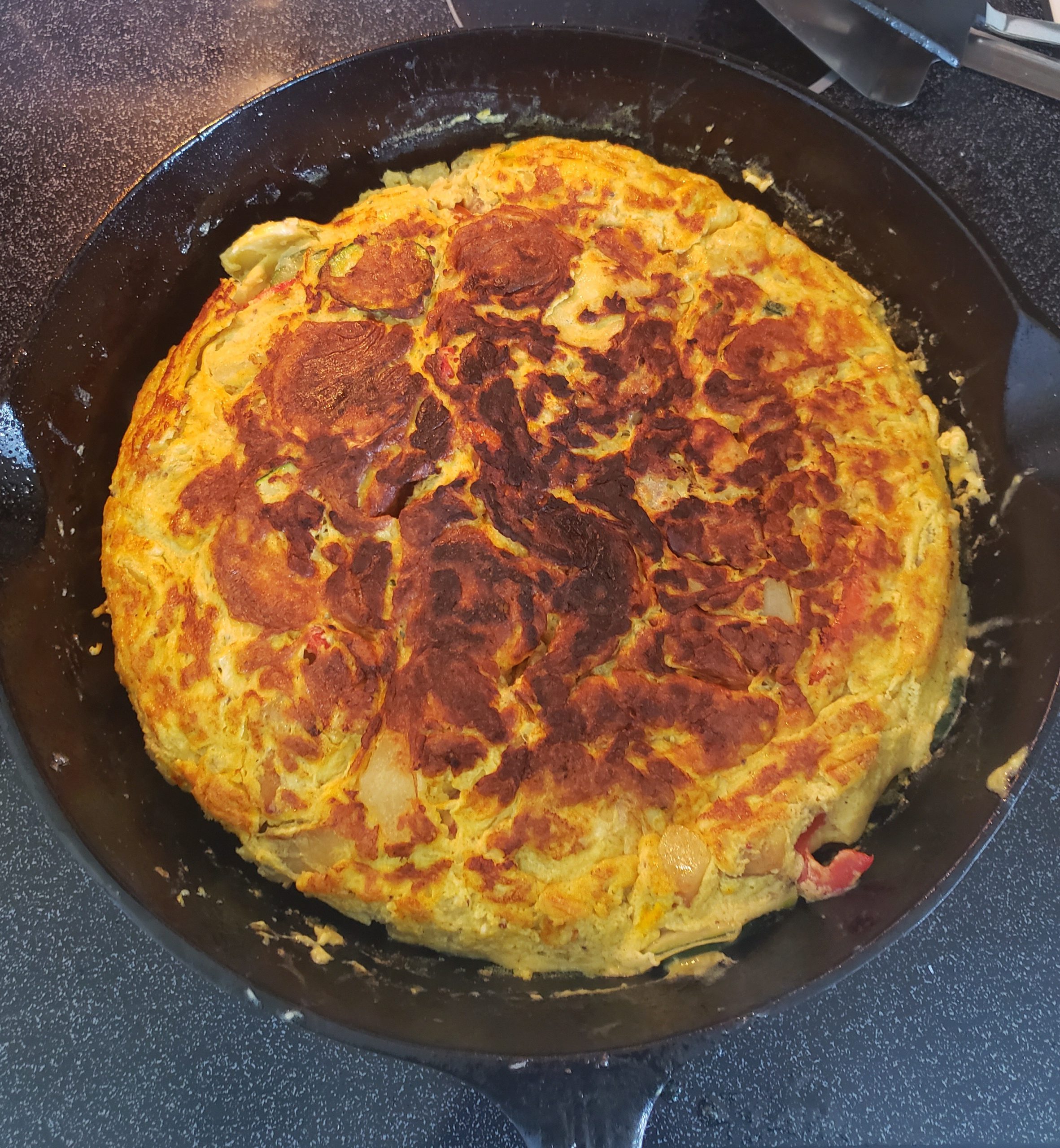 Add egg mixture and give it a shake/stir to allow eggs to cook. The key is, pull away edges without disturbing the whole tortilla, allowing eggs to cook. When the eggs are set, cover the skillet with a large plate and flip the tortilla. Slide it back into skillet and cook for about 2-3 minutes.