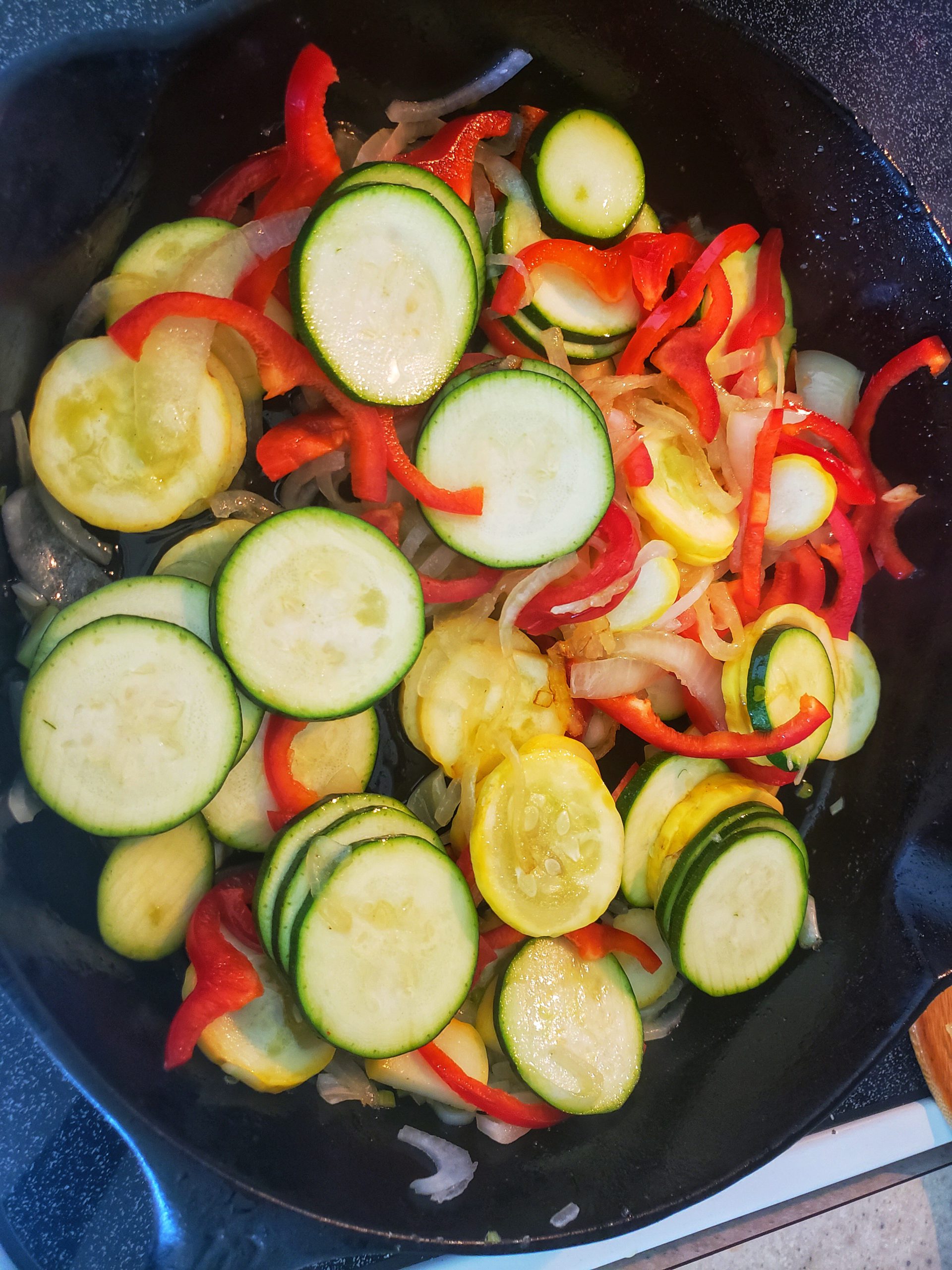 2Sauté, onions, bell peppers, and zucchini in a medium saucepan with a drizzle of oil. Cook vegetables until tender. Drain in a colander and allow to cool.