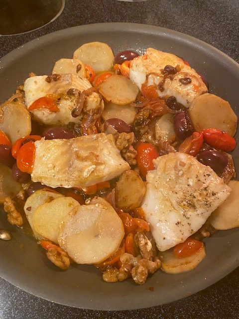 5When the potatoes are almost cooked, add the 4 pieces of Cod. Nestle the fish in the sauce. Cover and cook for about 5 minutes. Carefully flip the Fish over. Cover and cook for a few more minutes.